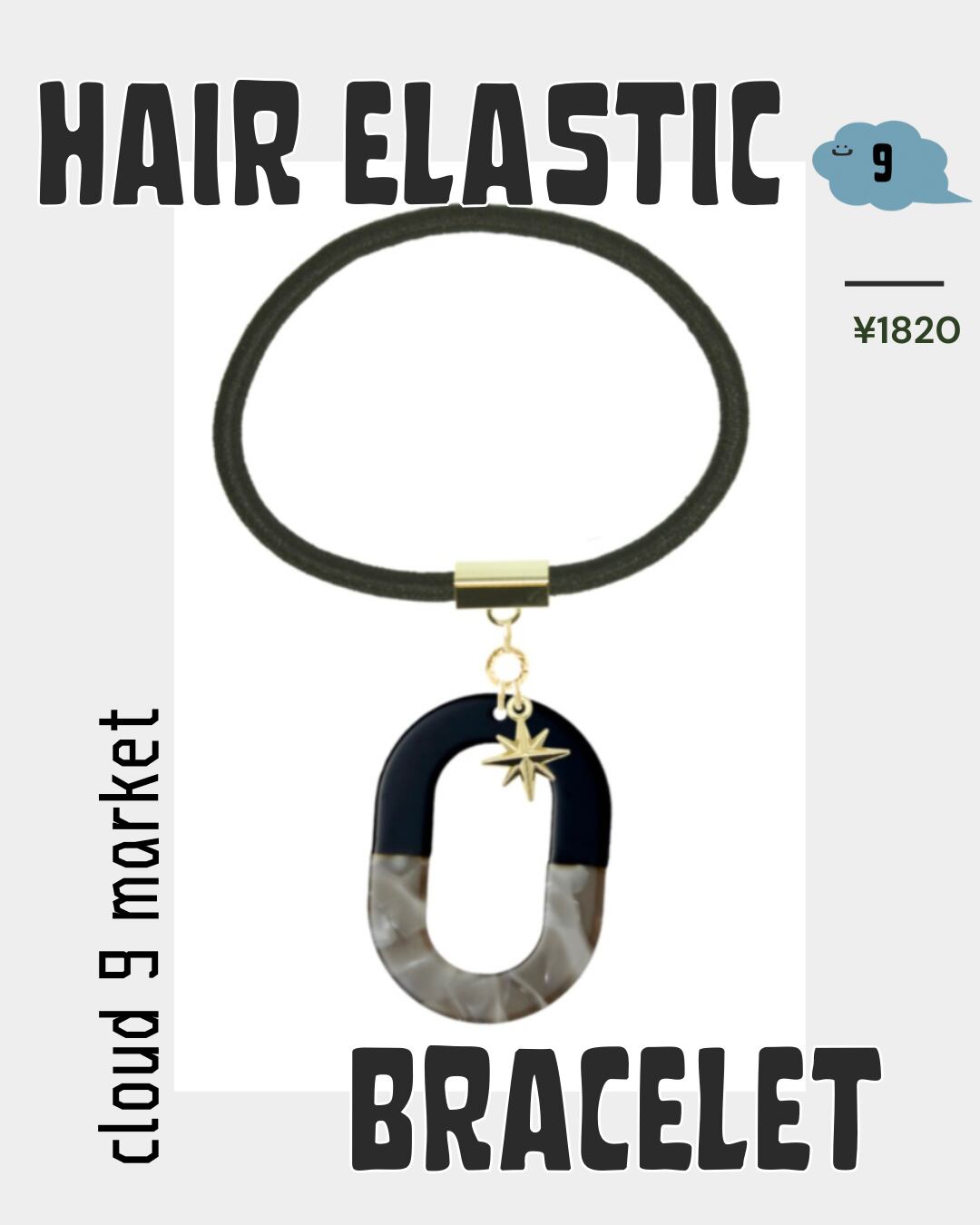ヘアゴムにバイカラーべっ甲柄リングパーツと立体キラキラチャームがついています。