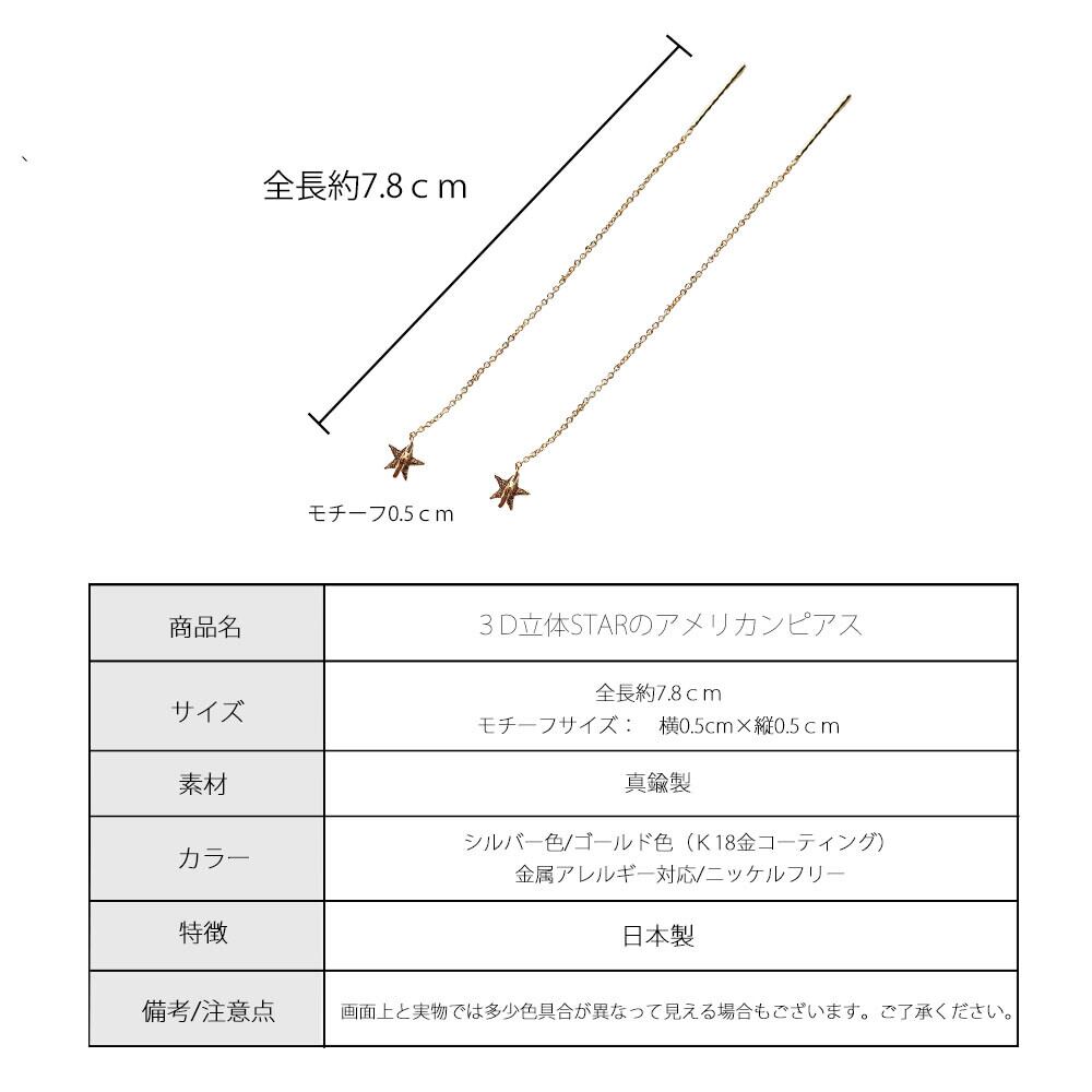 3Dフォルムが際立つ、立体スターのアメリカンピアス。ゴールドとシルバー、どちらも洗練された輝きで耳元を華やかに演出。揺れるたびに光を反射し、横顔に立体感と遊び心をプラス。MADE IN JAPANの確かな品質で、敏感肌にも安心。